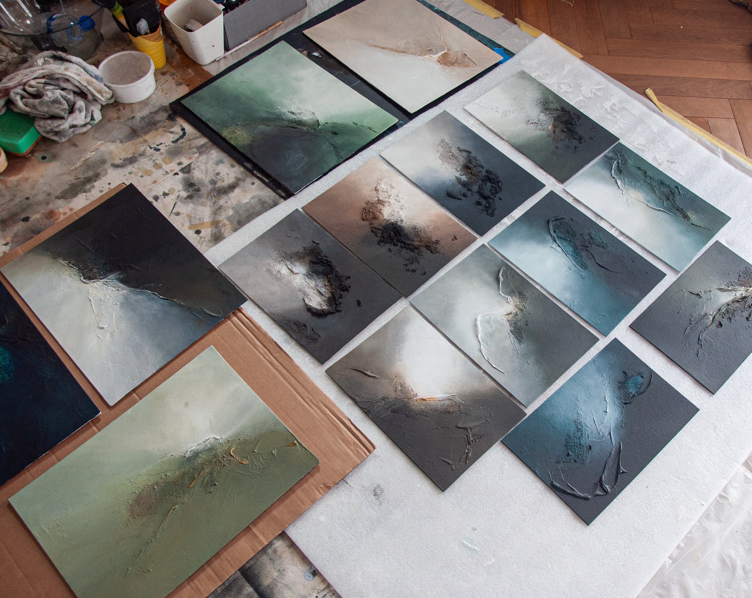 Acrylic, sand, spray, and graphite on canvas board